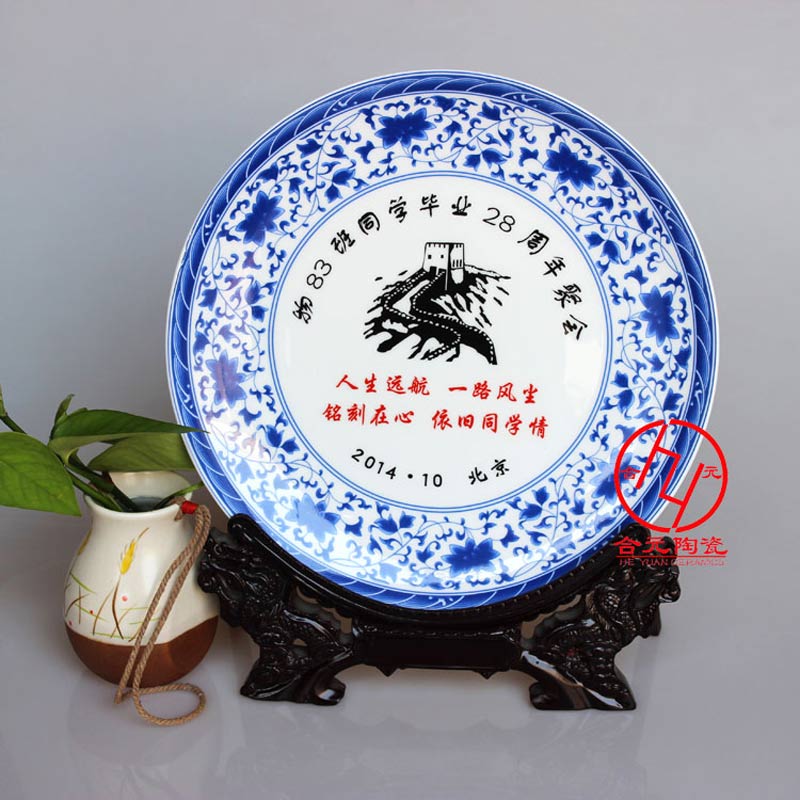 我们陶瓷纪念盘的工艺有贴花,绘画等,纪念盘的规格有15-40cm不等,景德镇合元陶瓷是家专业的陶瓷礼品纪念盘定制厂家,有着丰富的经验!他们特别希望大家能够定制到自己喜欢的礼品!