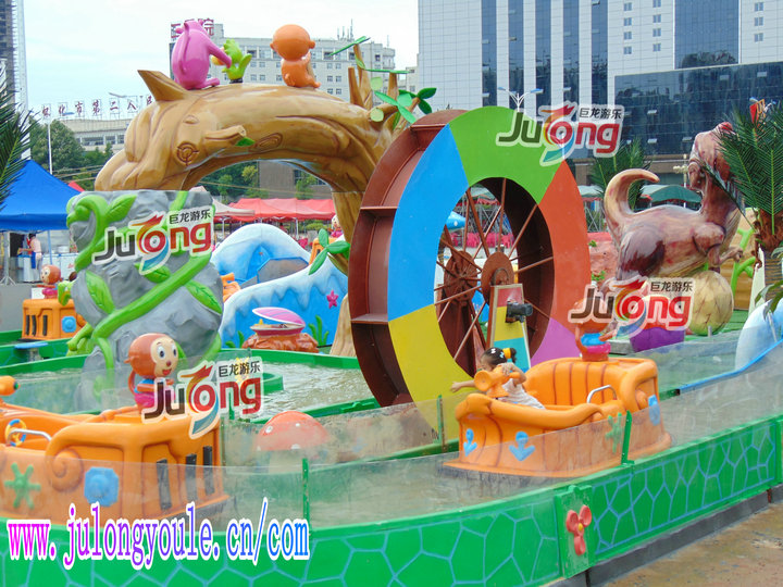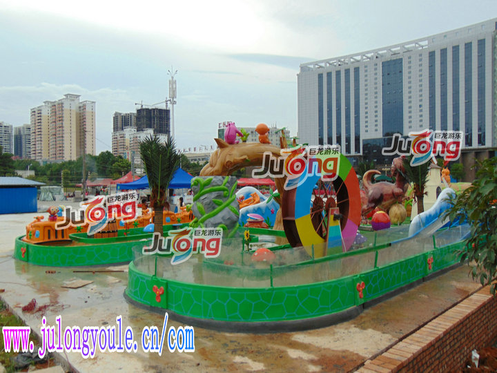 丛林探险是一款新型的儿童漂流项目。是我公司研发的一款新型游乐设施,游客手持激光枪乘坐木筏状的漂流船进入热带丛林。场景中有很多可爱的动物,游客可以通过激光枪射击靶点,使动物们做出各种可爱搞怪的动作。整个项目参与性、互动性极强,玩起来有一点点小刺激,却又妙趣横生!创意独特,互动性强,深受广大小朋友及游客喜爱。