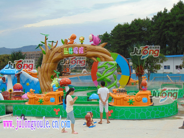 丛林探险是一款新型的儿童漂流项目。是我公司研发的一款新型游乐设施,游客手持激光枪乘坐木筏状的漂流船进入热带丛林。场景中有很多可爱的动物,游客可以通过激光枪射击靶点,使动物们做出各种可爱搞怪的动作。整个项目参与性、互动性极强,玩起来有一点点小刺激,却又妙趣横生!创意独特,互动性强,深受广大小朋友及游客喜爱。
