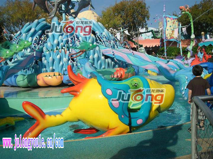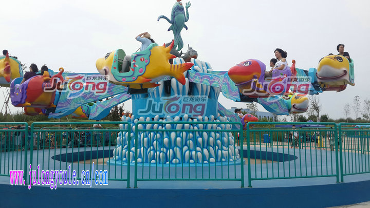 海洋总动员是许昌巨龙游乐设备有限公司新研发的一款水上旋转类游乐设备。整套设备的色彩搭配和谐完美,清新亮丽;中间珊瑚岛造型的底座托起几只形态可爱的小丑鱼,飞鱼造型的座舱,卡通可爱,非常吸引游客尤其是小朋友的眼光。带动座舱的大臂使用色彩鲜艳的玻璃钢装饰,工艺精良,外观靓丽。产品集升降,旋转于一体,增添了更多娱乐趣味。