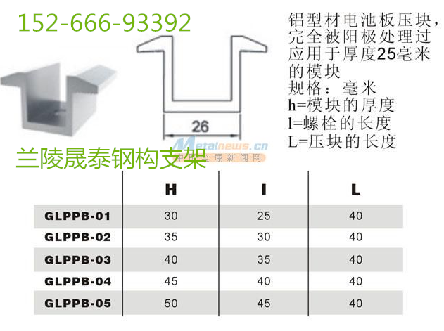 太阳能光伏支架配件铝压块 铝中压块 中压码 产品材质:铝合金6063-T5表面处理:银白阳极氧化,氧化膜厚10um,抗腐蚀产品硬度:≥10HW压块种类:边压,中压,薄膜中压,薄膜边压(配EPDM胶条)压块规格:中压块20/26/28(电池板间距);边压块35/40/45/50(组件高度)压块长度:40mm,50mm,60mm或定制压块用途:适用于绝大多数光伏组件,应用于光伏地面或屋顶系统安装质量保证:10年质保及20年使用寿命公司可以按客户需求定制生产不同规格型号的单晶/多晶硅电池板组件(侧压码/中压码)铝合金压块应用于太阳能光伏地面和屋顶的安装,配合太阳能光伏支架固定太阳能电池板。铝合金压块分为中压块和边压块。中压块或边压块的规格可依据客户电池板的厚度确定。电池板压块系列(单/双侧压块):应用:牢固锁定电池板边压块、中压块 的种类可根据客户的图纸要求定做,以达到适应客户电池板的要求。设计为流线型,增加美观性。本套产品的特点是:成本低廉,组合方便,安装快捷,自由转换角度,应用广泛,定制加工,10年保证,较高寿命,减小风压,排水减砂。