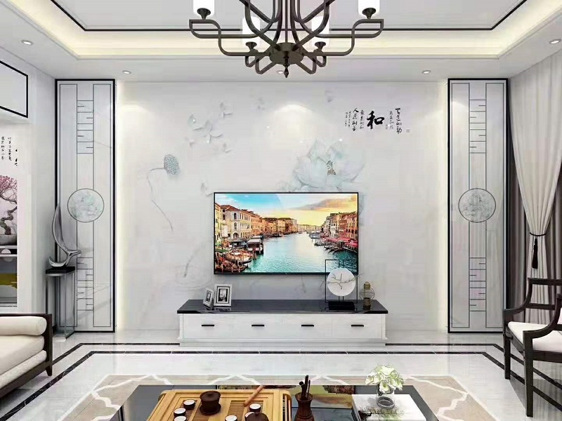 整体大板UV,是以人造汉白玉岗石为底材,单片可以做到1.2米宽*2.7米高,尺寸可以任意切割。石材大片厚重有质感,拼缝少,视觉效果佳。
