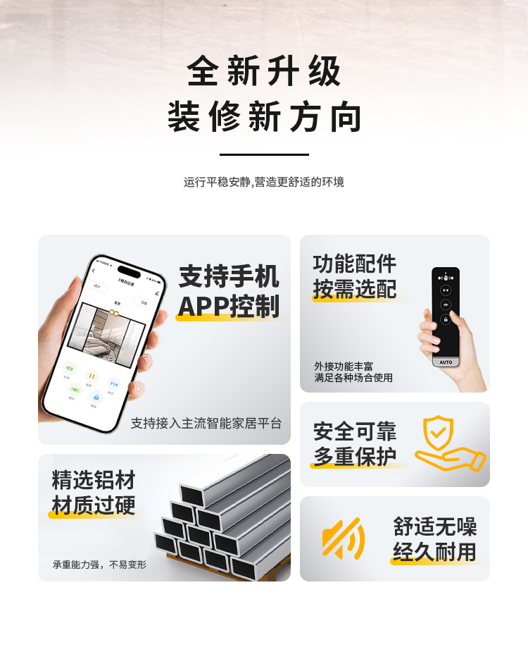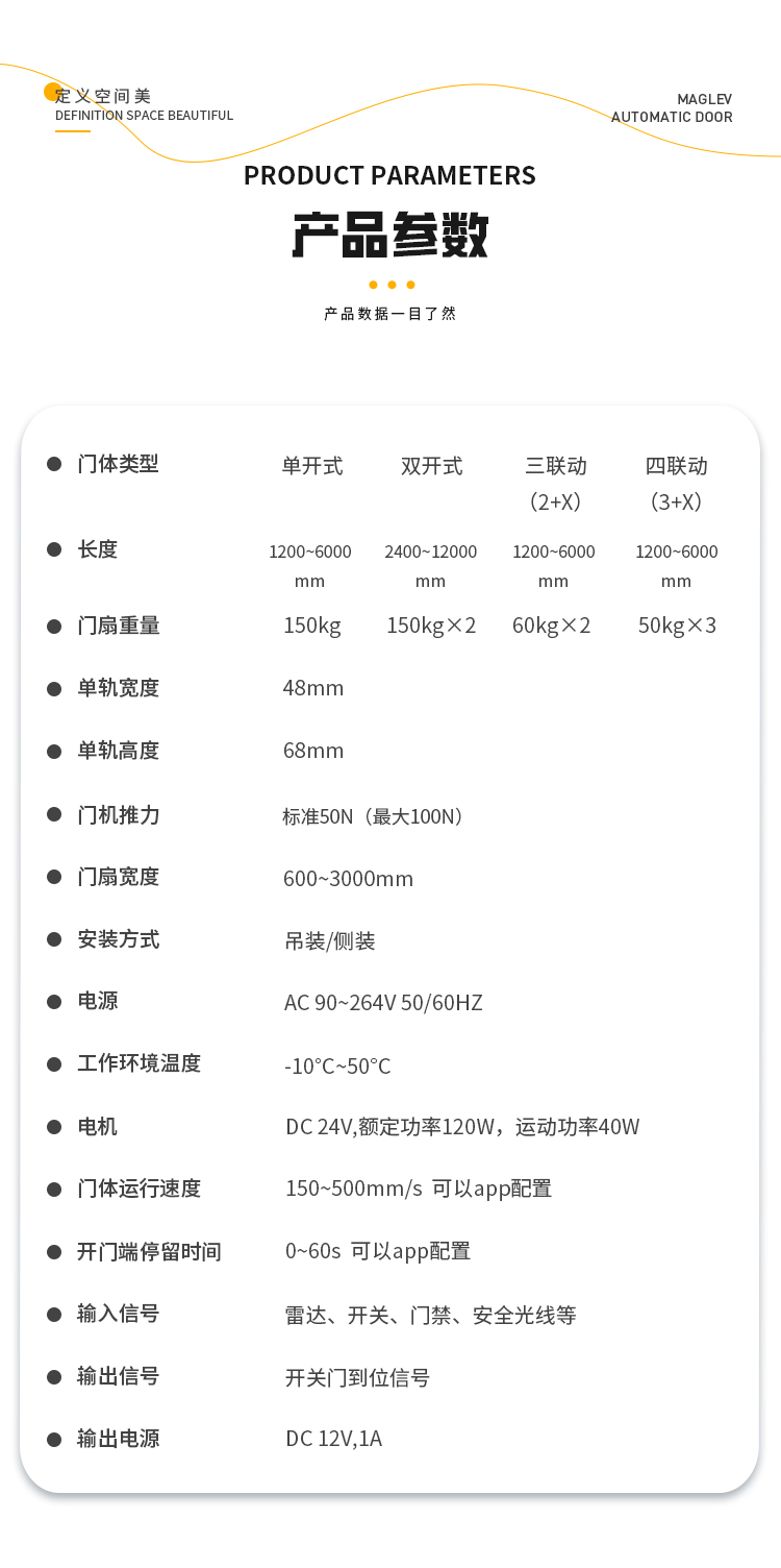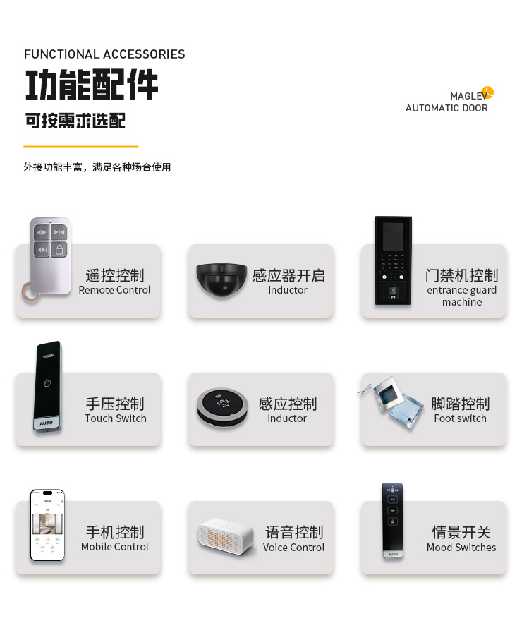 云蜗智能磁悬浮自动门适用场景广泛,能满足不同场景的需求,提升整体使用体验。可按需求选配功能配件,外接功能丰富,满足各种场合使用。
