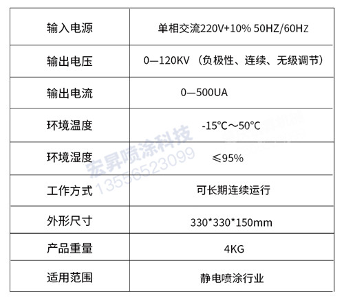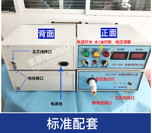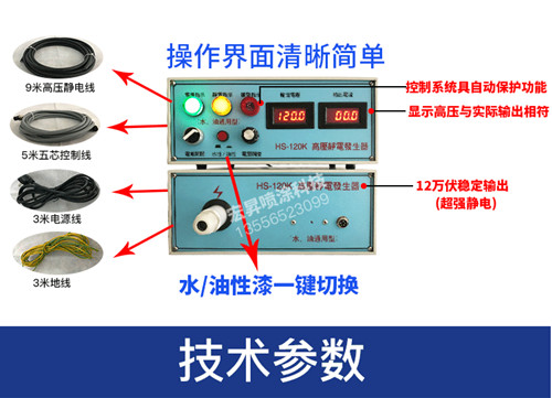120KV 高压静电发生器的稳定性强,性价比高,作业安全。高压静电发生器采用内置式自动保护电路设计,高压静电发生器有效防止由于放电距离贴近产生强火花现象;当高压静电输出短路(工人不慎碰触或放电距离过近),使放电电流达到设定保护值时机器会自动保护停机,(需要重启开机才能恢复工作)有效地确保设备运行及作业安全。高压静电发生器高压输出无级调节,可满足各种作业所需要的工作电压;设备可连续运行,使用寿命长等优点;可以单独安装使用,适合不同品牌DISK圆盘型静电喷漆设备及高压静电设备使用。
