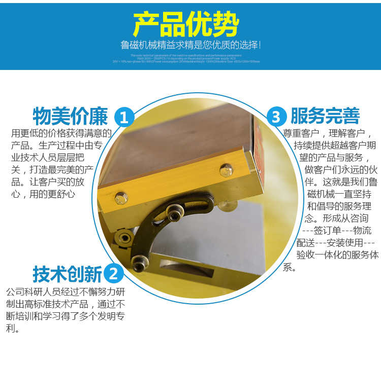 品牌优势 :鲁磁机械本着诚为金,信为本的经营理念在短短几年内与全国各大知名企 业形成良好合作伙伴关系,得到广大客户的认可。如;三一重工,海尔,海信,北汽,中国一汽等等,树立自己良好企业信誉和品牌形象。