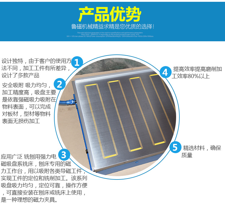 吸力均匀,加工精度高,吸盘主要是依靠强磁吸力吸附在物料表面,可以 完成对板材,型材等物料表面无损伤加工。