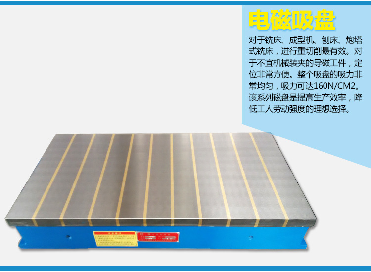 铣刨用强力电磁吸盘系铣床,刨床专用的磁力工作台,用以吸附各类导磁 工件,实现工件的定位和铣削加工。该系列吸盘吸力均匀,定位可靠,操作方便,可直接安装在刨床或铣床上使用,是一种理想的磁力夹具。