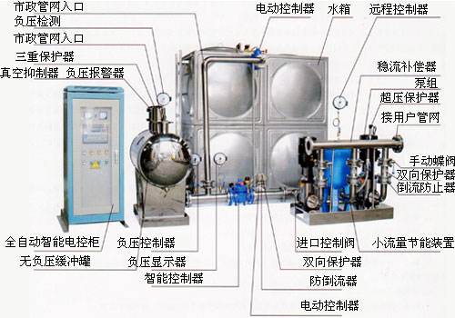 无负压变频给水设备是由无负压罐、泵组、控制柜、稳压罐及管阀附件组成的供水设备,是将系统设备串联在市政自来水管压力不足的地方,设备通过压力传感器检测出口压力,将检测值和设定值进行比较,运算出在市政自来水管的原有压力基础上需要增加的压力值,确定水泵投入运行的台数各变频器输出频率(反应到电机及水泵为转速)以符合用水曲线实现恒压,无负压变频给水设备限度的利用了市政自来水管网的原有压力,对市政自来水管网不产生负压,用无负压罐取代老式水池,减少了用水二次污染,是供水领域的新一代节能型产品。