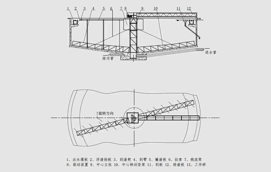 该设备采用中心传动、垂架式,污水从进水管流入导流筒扩散后,均匀的向周边呈辐射状流出,呈悬浮状的污泥经沉淀后沉积于池底,驱动装置带动中心竖架旋转,并带动刮臂及刮泥板转动,将污泥从池周刮向中心集泥槽后,靠池内静水压由排泥管排出池外。水面的浮渣通过撇渣装置撇向池边,再由刮渣耙刮进排渣斗内排出池外。而上清液则通过出水堰板溢入出水槽内排出。