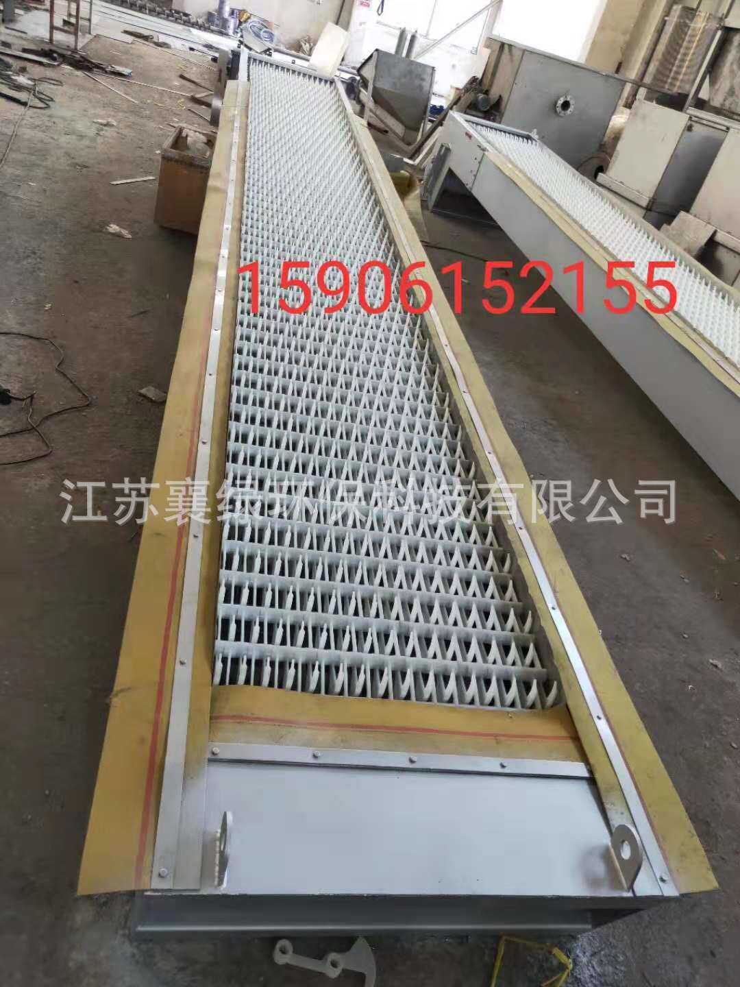GF回转式机械格栅除污机,又称回转式固液分离机,是由犁形耙齿按一定的数量和装配顺序排列在耙齿轴上,组成耙齿链,根据过水流量和需要分离的固物颗粒大小,选用不同栅隙的耙齿。将本设备安装在泵站或水处理系统的入口处,当传动系统带动耙齿链自下向上运动时,耙齿同时携带悬浮物从液体中分离出来,液体则在间隙中流过,耙齿轴转动到上部定点后,改变运动方向,自上而下运动,由于物料的自重从耙齿上自行脱落,当耙齿轴从反面转到设备底部时,又开始由下向上运动,这样循环往复连续运行,不断的从水中清理杂质,达到固液分离目的,整个过程可以是连续的也可以是间歇的。