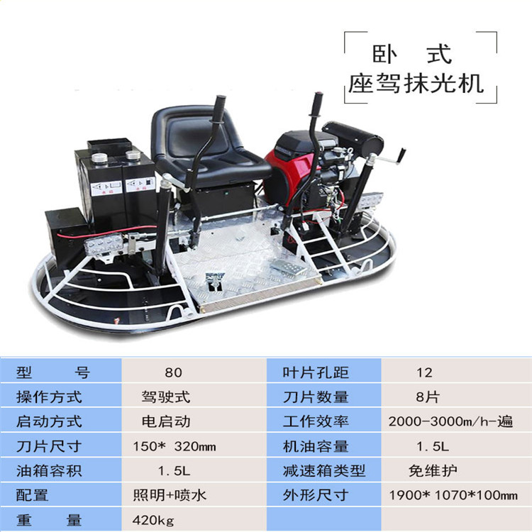 2.驾驶型的操作大大的降低了劳动强度,双刀盘结构,重量大,对地面具有更好的压实效果,施工 效率明显高于手扶抺平机;