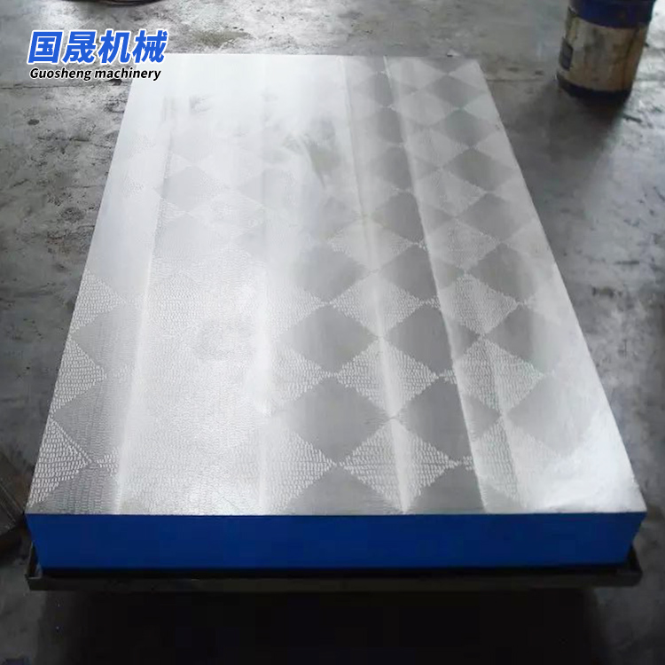 刮研平台精度等级有000、00、 0、1、2、3级及精刨,其中2级以上平板为检验用,3级以上为划线用。平板制成筋板式和箱体式,工作面有长方形、正方形或圆形。 工作面采用刮研工艺,工作面上可加工V形、T形、U形槽和圆孔、长孔等。工作面硬度HB170~240.经过两次时效处理(人工时效及自然时效2~3年).使该产品的精度稳定而抗磨性好.使用寿命长。铸铁刮研手工平板精度按国家标准计量检定规定规程执行。