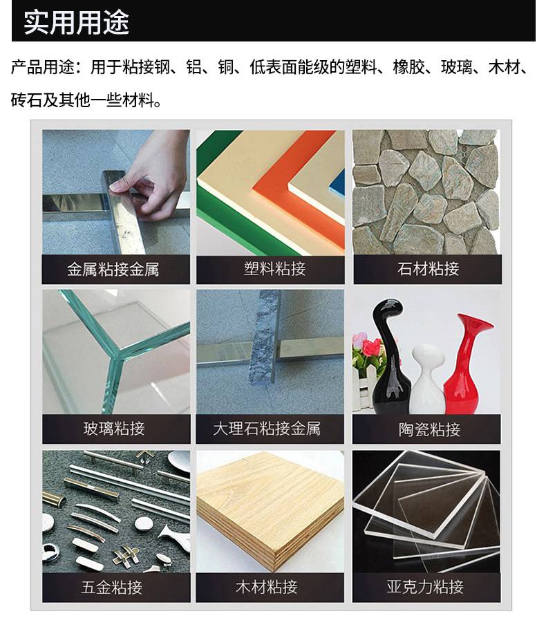 产品用途:用于粘接钢、铝、铜、低表面能级的塑料、橡胶、玻璃、木材、砖石及其他一些材料。
