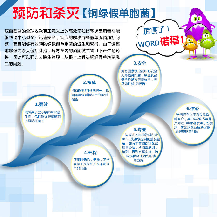 铜绿假单胞菌具极强的抵抗力,又可粘附于管道、滤膜、贮水槽及增压泵等中繁殖,简单的冲洗、常规的消毒技术难以对其进行清除。有关专家建议使用诺福饮用水消毒杀菌剂。