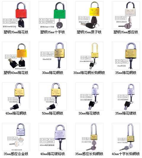 铜质电力表箱锁、塑钢电力表箱锁、锌合金挂锁、镀铬锁、镀镍锁。不锈钢锁、铁锁。