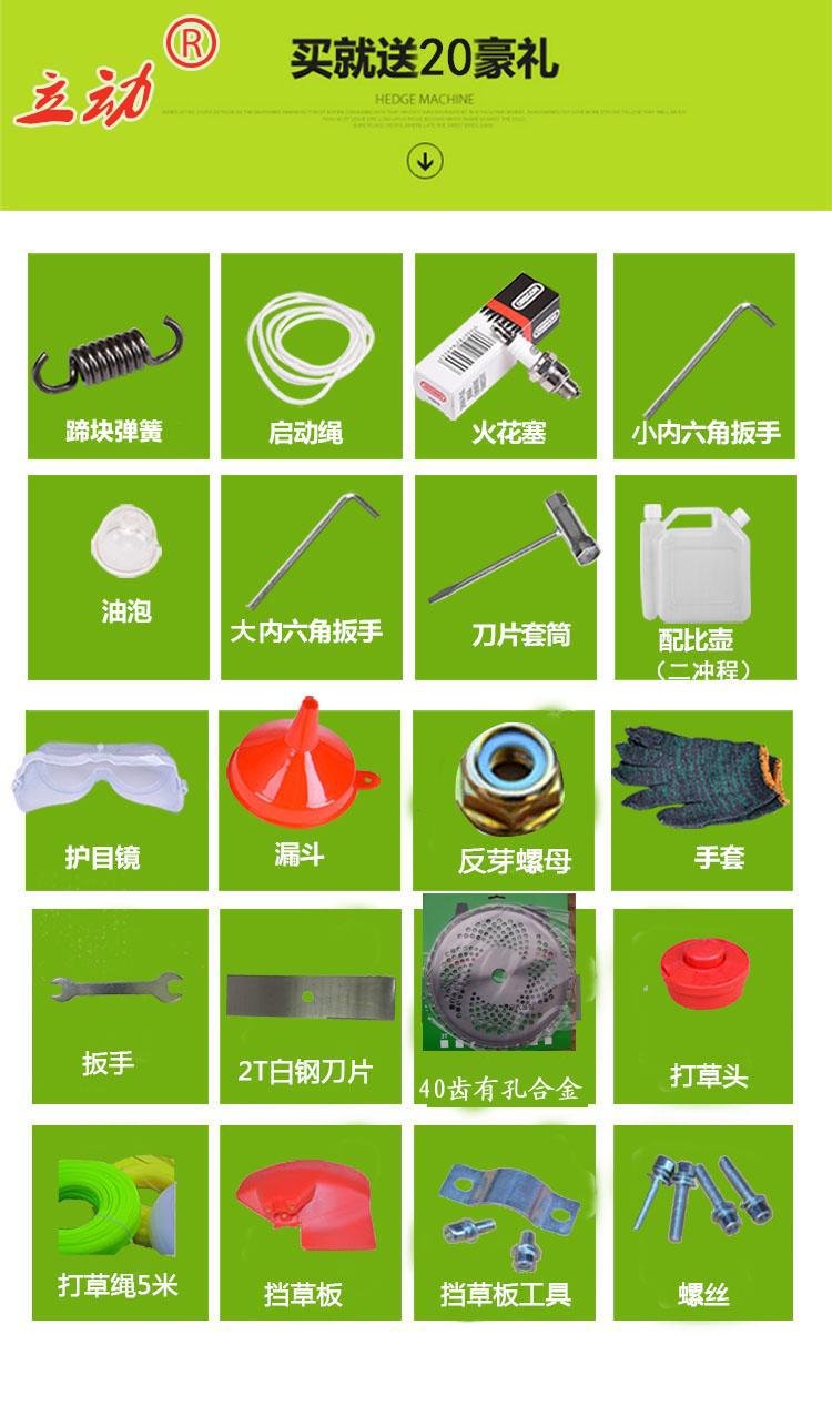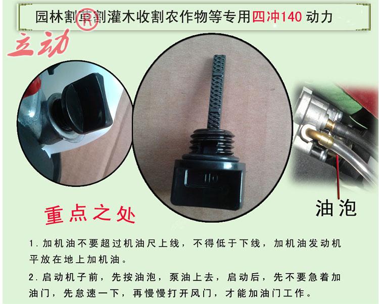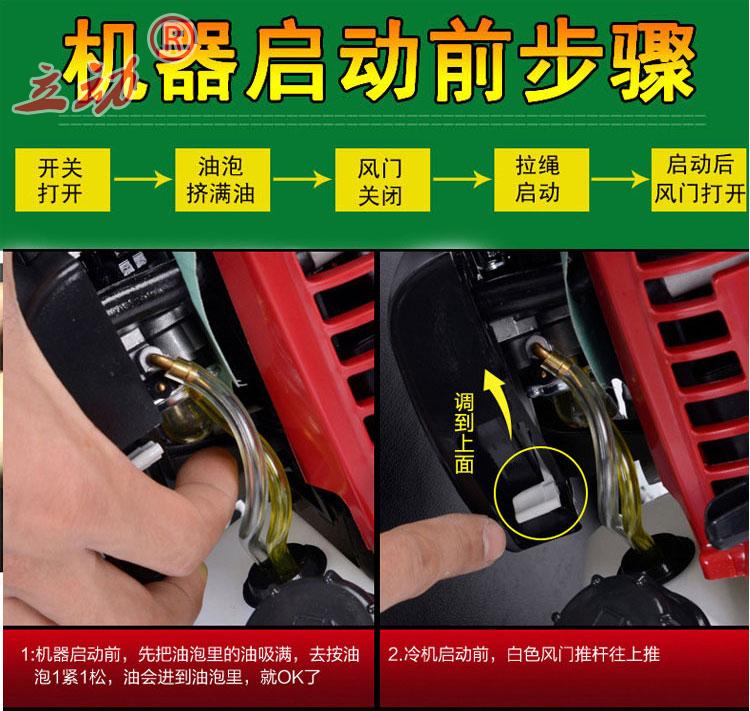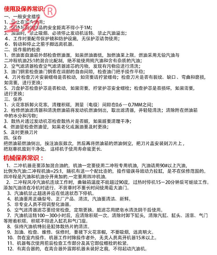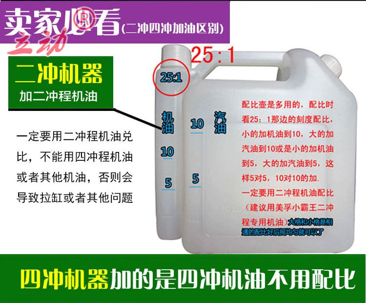 1、二冲机器是要添加混合油的,机油一定要使用二冲程专用机油,汽油请用90#以上汽油,比例为汽油:二冲程机油=25:1,随机有送一个配比壶的,操作错误导致动力拉缸,是不在保修范围的。