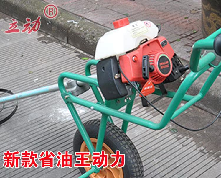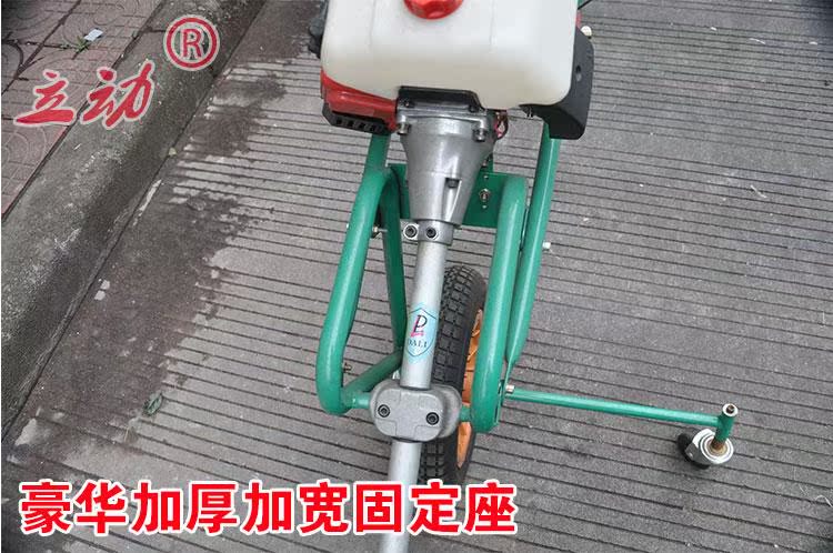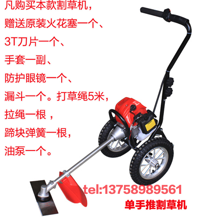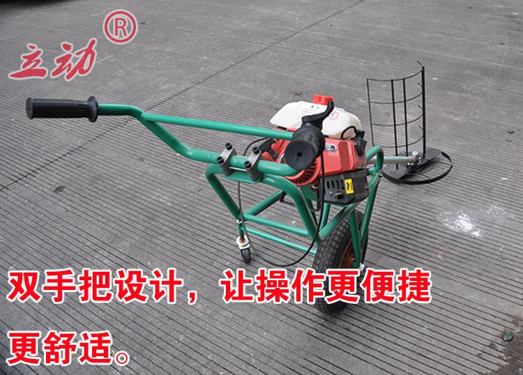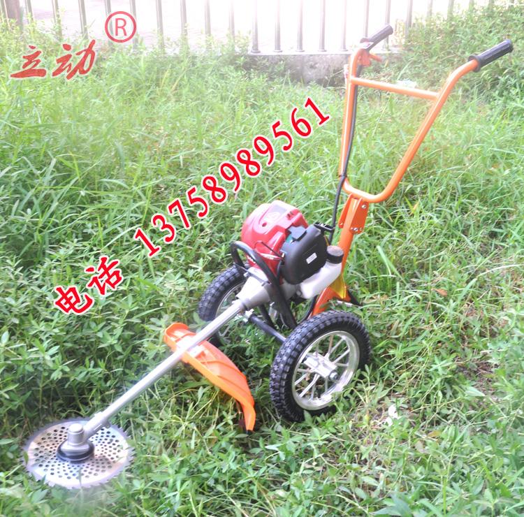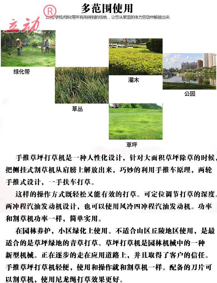 手推草坪打草机是一种人性化设计,针对大面积草坪除草的时候,把侧挂式割草机从肩膀上解放出来,巧妙的利用手推车原理,两轮手推式设计,一手扶车打草。这样的操作方式既轻松又能有效的打草。可定位调节打草的深度。适用于草坪青草打草。机器采用风冷两冲程汽油发动机设计,也可以使用风冷四冲程汽油发动机。功率和割草机功率一样。简单实用。在园林养护,小区绿化上使用。不适合山区丘陵地区使用,最适合的是草坪绿地的青草打草。草坪打草机是园林机械中的一种新型机械。正在逐步的走在应用道路上,并且取得了客户的信任。手推草坪打草机轻便,使用和操作就和割草机一样。配备的刀片可以割草机,使用尼龙绳打草效果更好。