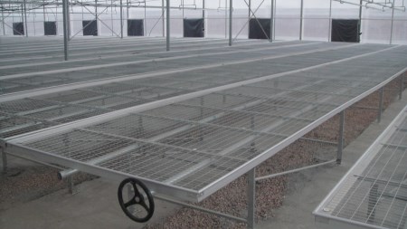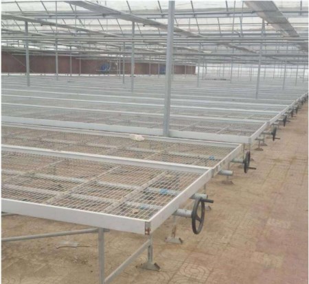 1.手动驱动,操作简单,移动方便。苗床边框为铝合金材质,可向左、右移动,任意两个苗床之间可产生0.6m的作业通道,能使温室的使用面积达80%左右。