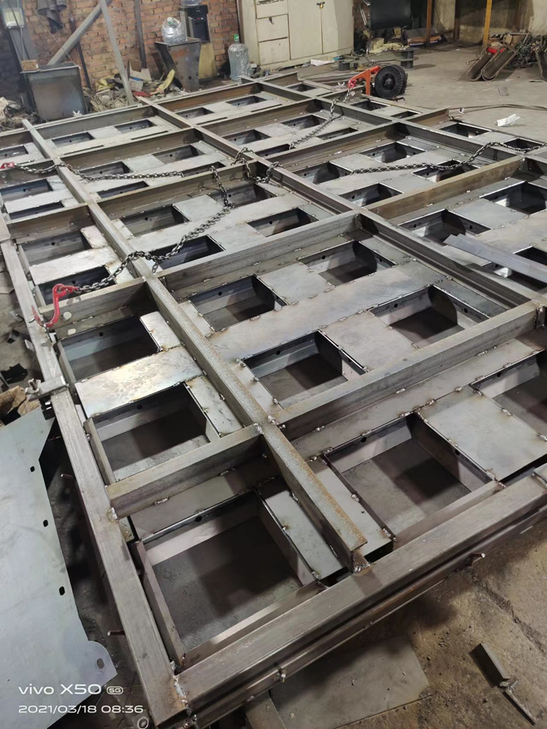 联锁块软体排模具制作成整体的,是由内模和外模两部分组成的,在模具的内侧进行混凝土的浇筑,内模的样式是由一个一个的格子呈现的,制作出来的混凝土制品的样式也是一块一块的样式,拆模,是对内模整体进行拔模,然后使用吊装机吊出混凝土制品。