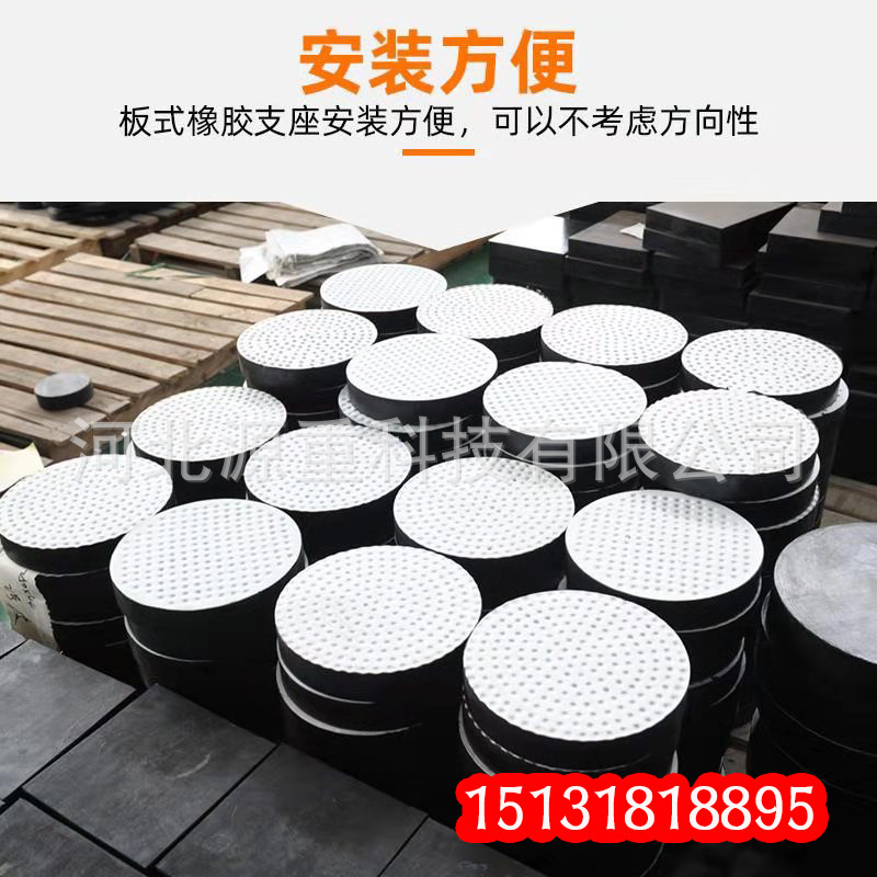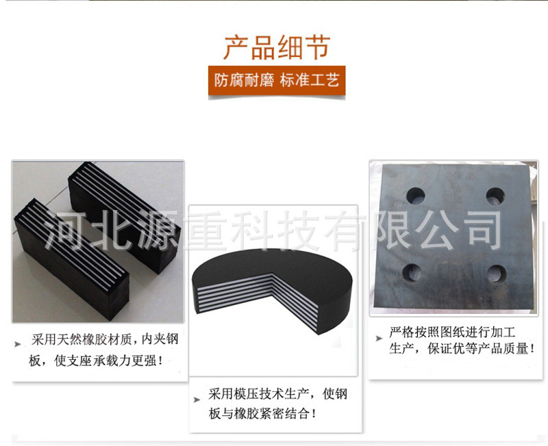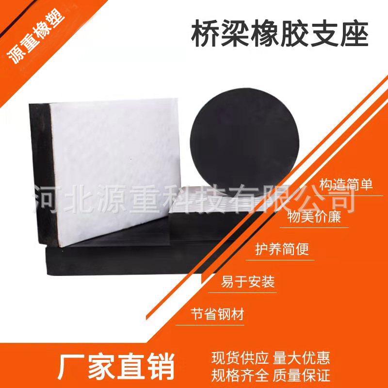 板式橡胶支座在桥梁建筑、水电工程、房屋抗震设施上已广泛应用,与原用的钢支座相比,有构造 简单,安装方便;节约钢材,价格低廉;养护简便,易于更换等优点,且本品建筑高度低,对桥梁设计与降低造价有益;有良好的隔震作用,可减少活载与地震力对建筑物的冲击作用。