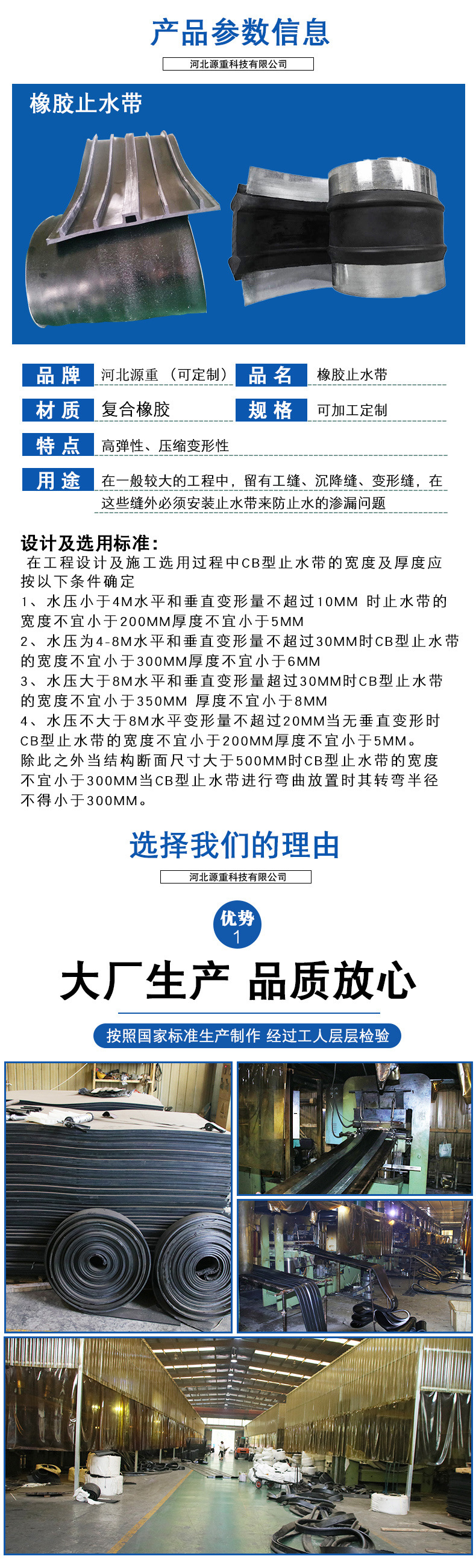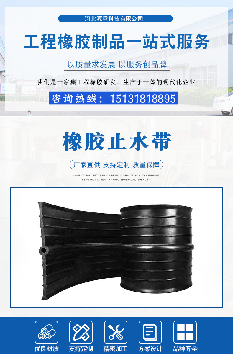 橡胶止水带的种类可分为: 背贴式橡胶止水带, 注浆式橡胶止水带, 钢边止水带,平板式橡胶止水带,三元乙丙橡胶止水带,遇水膨胀橡胶止水带, 波浪型止水带等等。中埋式橡胶止水带是在橡胶止水带的一种