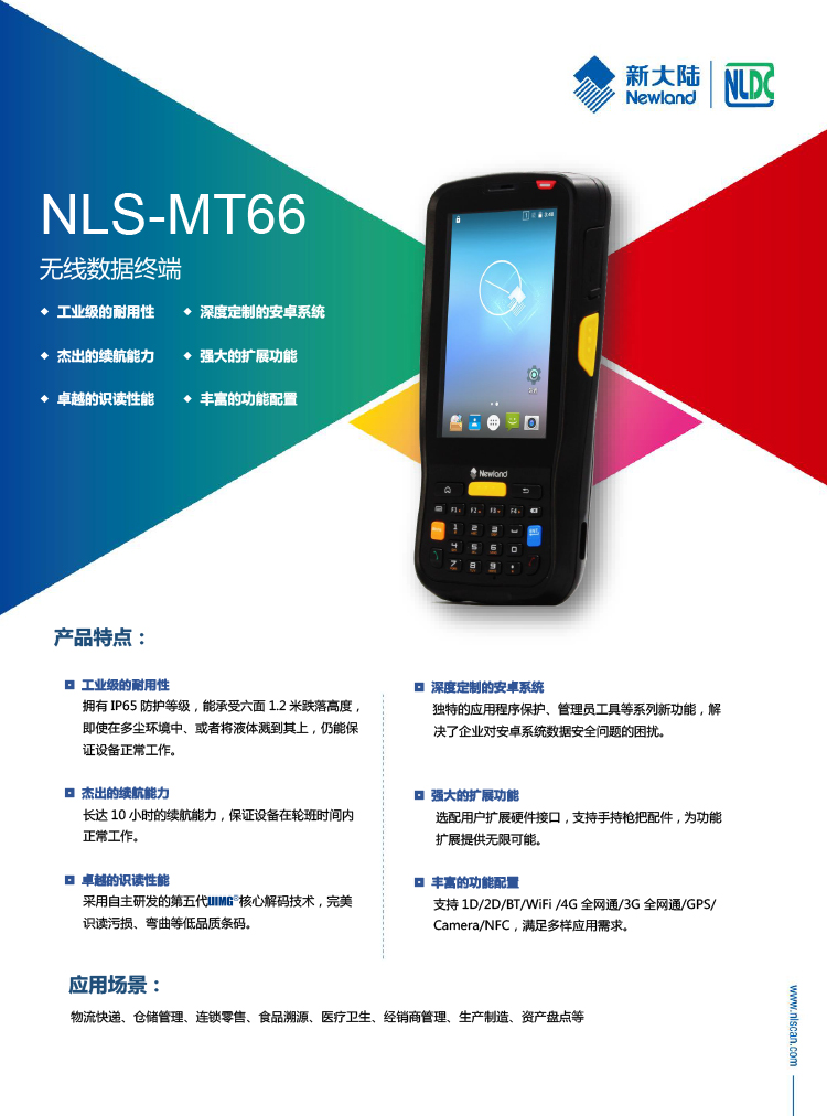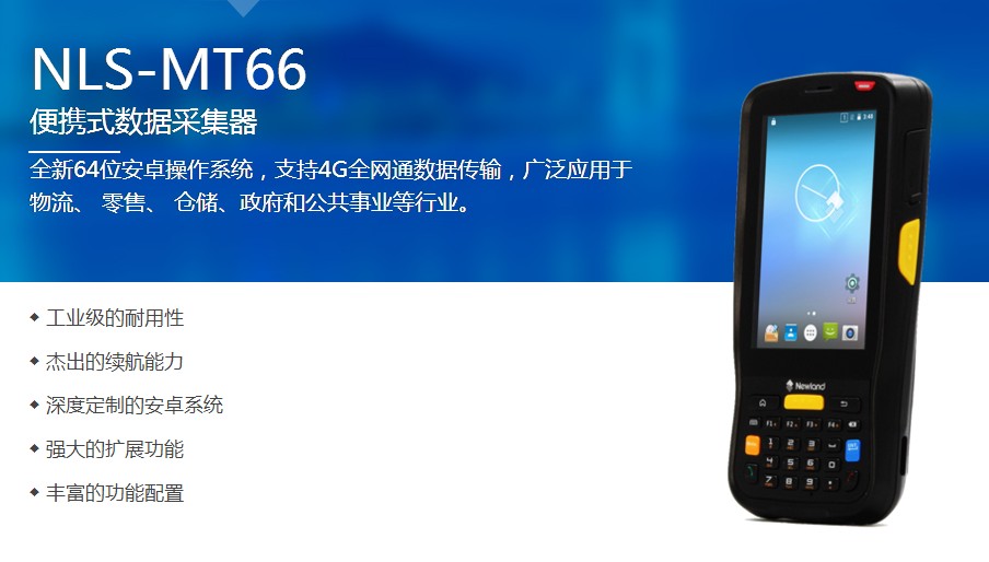 NLS-MT66 便携式数据采集器内置安卓操作系统,支持一维和二维条码扫描,可通过4G无线数据通信、蓝牙、Wi-Fi进行数据的传输。广泛应用在物流、零售、仓储、医疗卫生、政府和公共事业等行业。