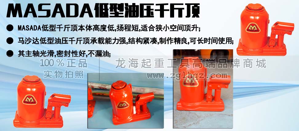 MASADA低型油压千斤顶属于日本MASADA马沙达产品,所谓低型油压千斤顶,就是千斤顶的本体高度相比标准的油压千斤顶要低,更适合用于顶升空间有限的狭小空间使用,此品牌旗下的千斤顶产品,质量没话说,在国内也拥有众多的拥护客户,口碑一直不错,如果想购买日本原装进口产品,可咨询我公司—烟台龙海起重工具有限公司,我公司承诺原装进口,假一罚百;【保质一年】