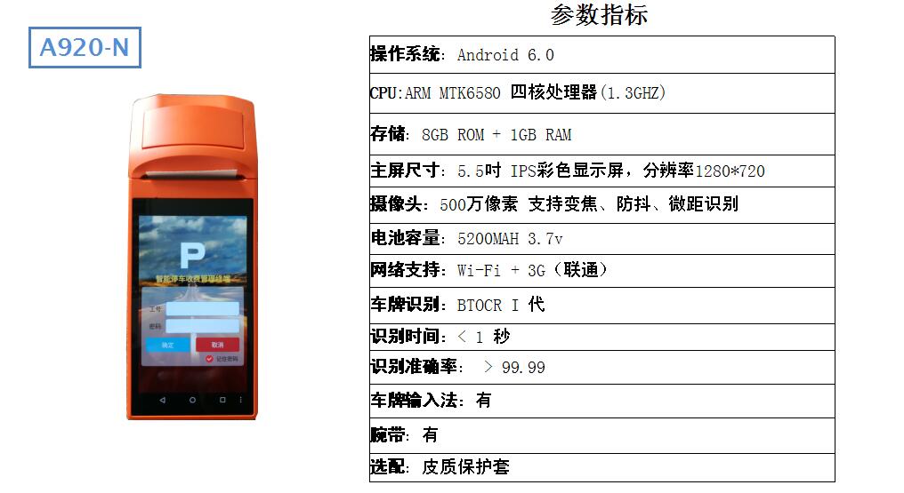 T920停车场车牌识别手持终端,独立于传统的电脑PC平台的支持,最大程度上利用了安卓系统的高性能、大存储的特点,一台手持设备,随时随地即可完成收费。账务明细可导出可汇总,收费人员业绩可分类统计。主要用于路边停车(如:城市路边停车、城市占道停车、大型停车场等)。该系统支持临时卡(按预设的收费规则进行计时收费)和月卡(指定有效期,可包月、包年)模式。