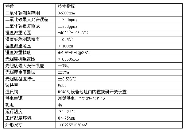 SM3390B 二氧化碳、光照度及温湿度一体传感器为RS485总线式传感器,是针对农业生产过程中环境监测而设计的专用传感器,仪器能够连续监测二氧化碳气体浓度、光照度及环境温湿度等4种环境参数,每个参数值都转换成MODBUS-RTU标准RS485电信号传输给关联设备。