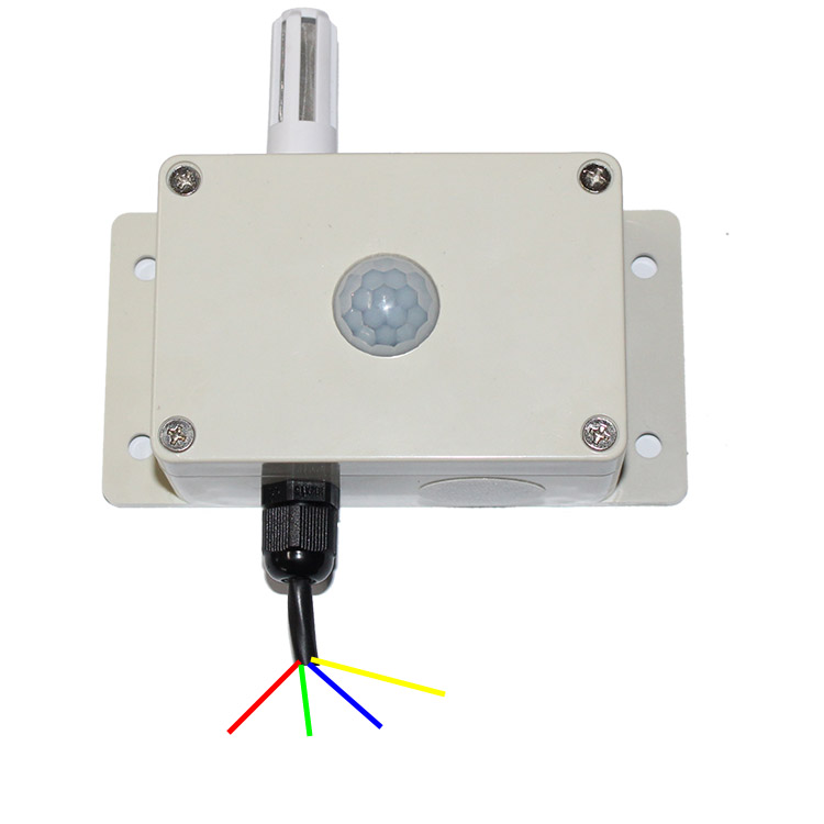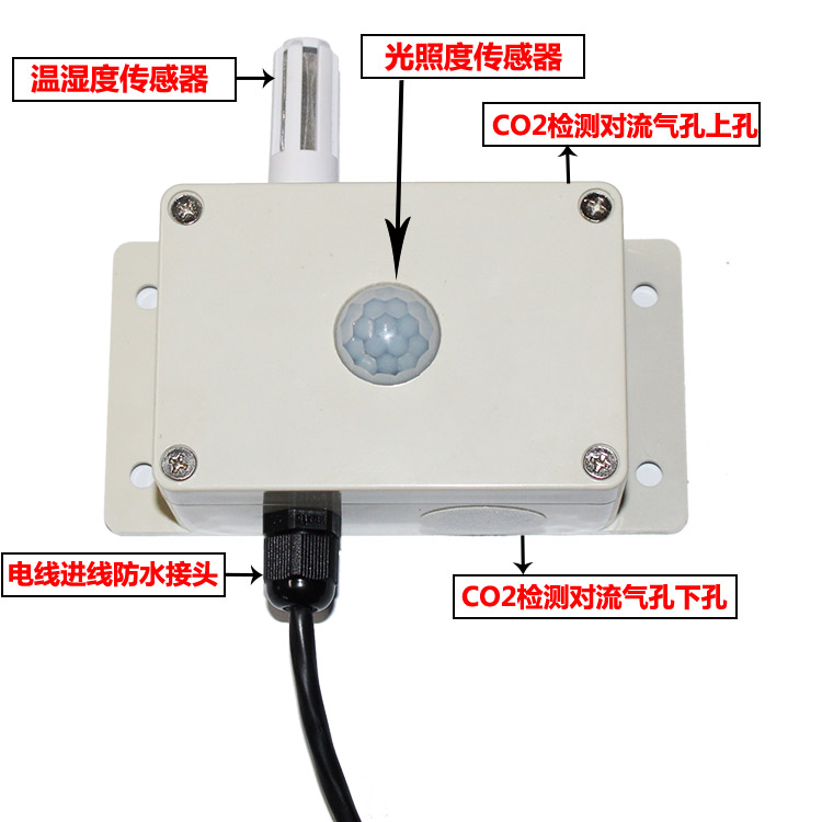 如上图所示,产品由红外CO2传感器、光照度传感器、温湿度传感器、气体检测气窗(孔)及防水接头等几部分组成。