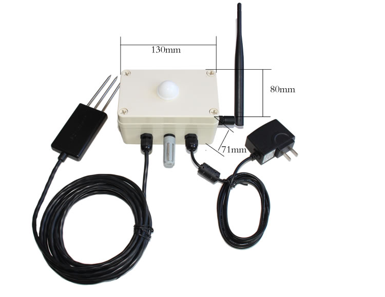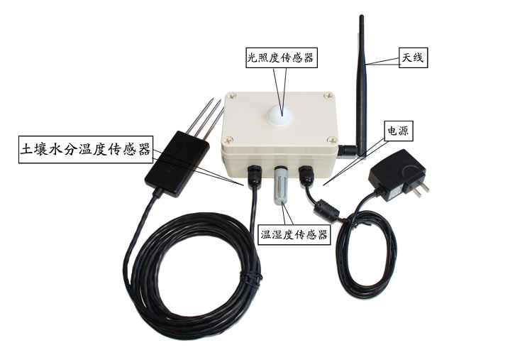 如上图所示,产品由土壤水分温度传感器、光照度传感器、温湿度传感器、天线及电源(通讯接口)几部分组成。