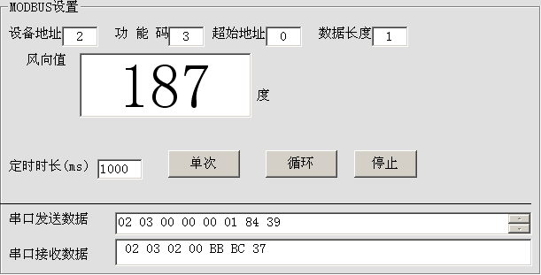 上例回复数据中:02表示设备地址为2,后面的02表示数据长度为2个字节,00 03为此时风向角度值(十六进制数),即把00 03转换成十进制就是3,表明当前的风向角度值为3度。