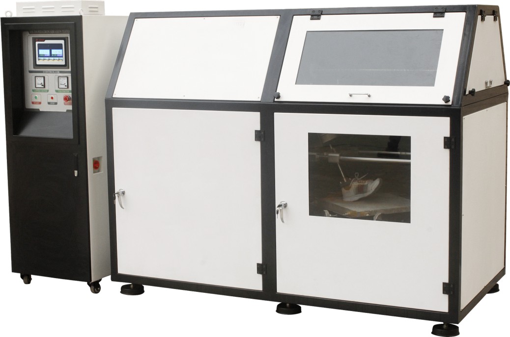 本机是模拟人在实际的行走过程中鞋子的磨损情况,其行走中的动动轨迹,速度和对鞋的压力基本与实际吻合.特别是鞋底前牚部与在踏步的过程中对水泥地板有转动磨损的动作与人在实际行走非常类似.大体可以评估为测试1200步(约6个小时)相当于实际穿鞋在30-80天的磨损程度.这有利于研究鞋底的材料,花纹工艺及其它异常磨损情况.
