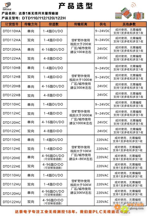 西安达泰电子有限责任公司创立于2002年,是一家集工业无线产品研发、生产、销售于一体的“智”造企业,产品具有“可靠、简单、智能”的特点,能够直接取代传统线缆,实现工业数据信号的无线传输。近20年间,达泰先后获得多项发明,常年与国内top50高校进行产学研合作、水泥行业供应商,同时也逐步组建起了一支具有丰富现场经验的PLC无线通讯团队,为客户提供多方位的技术保障。现已为国内外超30000家工厂企业成功实现近15万个无线采集测控方案设计和改造项目,投入使用的设备超100万套。DTD1系、4系无线产品广泛应用于水泥,冶炼,发电,煤炭,化工等复杂恶劣的工业场合,平均连续使用寿命超过5年以上。