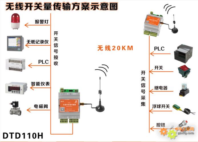 达泰1系无线开关量信号传输器 DTD110H实现点对点的开关量信号远传功能,发射端4-16路开关量输入,与接收端4-16路开关量输出信号一一对应。还可以选用双向开关量传输终端DTD112H,每个终端有4-8DI/4-8DO,两端的模块输入与输出相互对应。