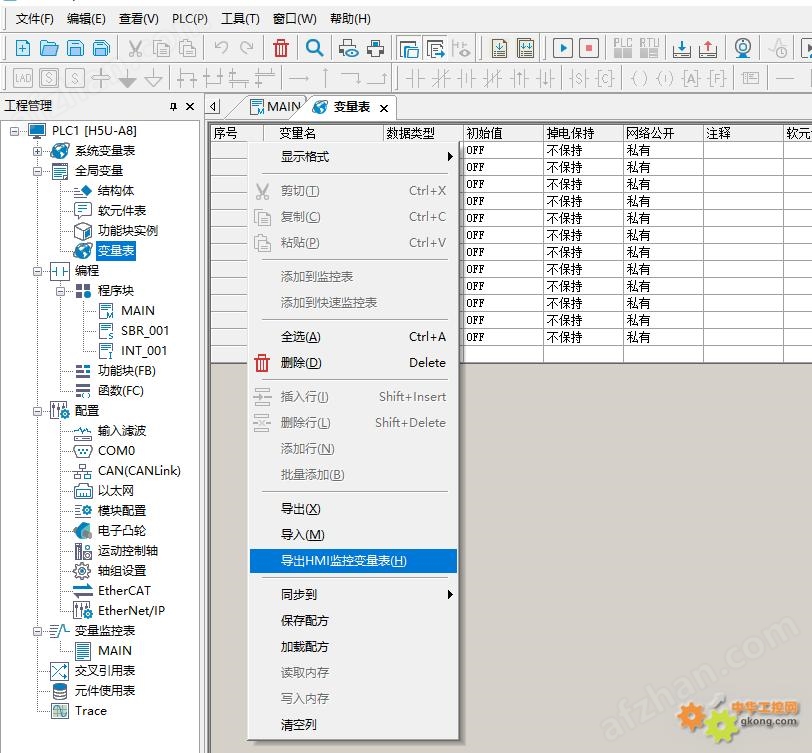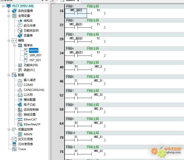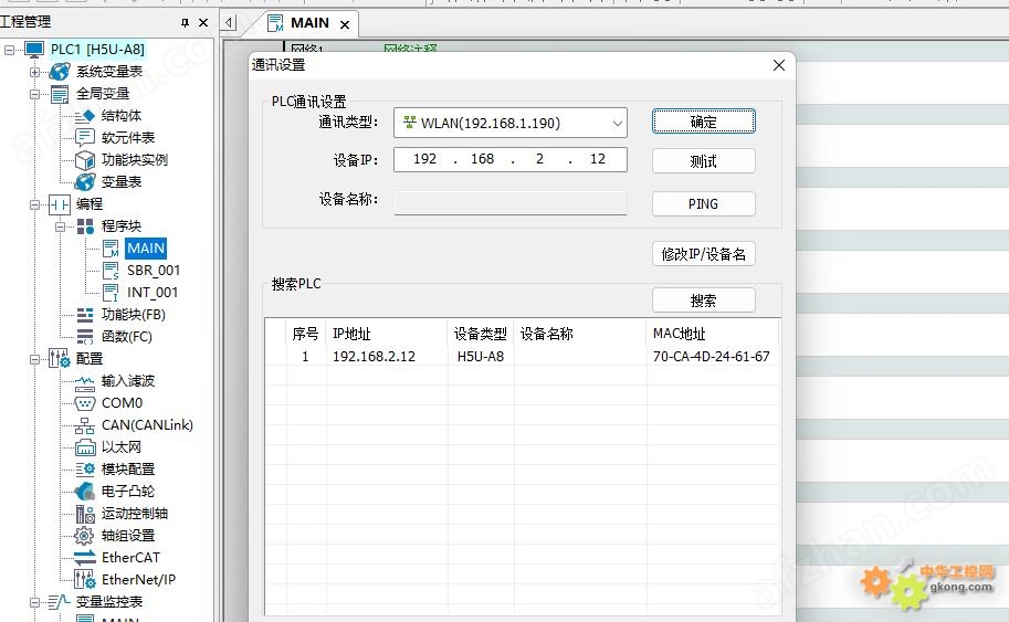 本方案例程源代码在《MCGS触摸屏与汇川H5U PLC无线ModbusTCP/IP通讯例程》文件内。