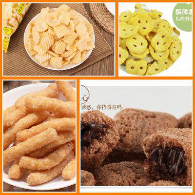 该生产线可生产各类膨化食品,香米饼等夹心卷(饼)及脆饼干、谷物粥、营养粉等食品。